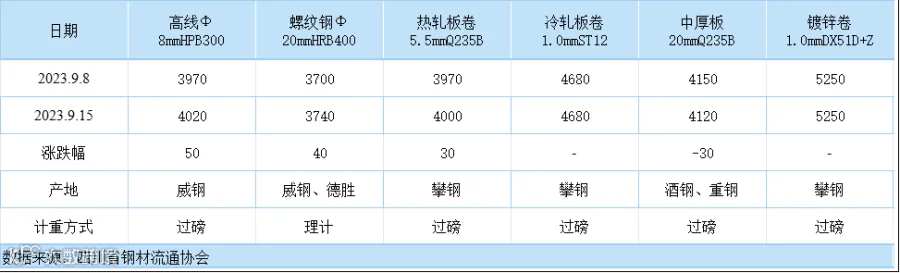 据四川省钢材流通协会对成都现货市场监测显示,本期建筑钢材价格先抑后扬,随着多城市相继官宣“认房不认贷”,提振市场信心,叠加中国人民银行14日宣布降准0.25个百分点,这是年内第二次降准,支撑期螺走高并带动现货上行。9月15日,成都地区Φ20mm HRB400螺纹钢价格为3740元/吨,较9月8日涨40元/吨;Φ8mm HPB300高线价格为4020元/吨,较上一周涨50元/吨。