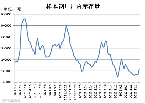 (12.16-12.23)据四川省钢材流通协会对四家样本钢厂关于建材厂内库存统计数据显示,截至12月22日,A、B、C、D较上周分别增加3000吨、7703.528吨、34000吨、12000吨。四家样本钢厂厂内总库存量为159013吨,周环比增加56704吨。