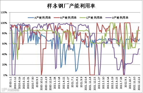(12.16-12.23)四川省钢材流通协会对四家样本钢厂关于建材产能利用率统计数据显示,A、B较上周分别上调4%、11.19%;C下调1%;D持平。