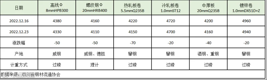 据四川省钢材流通协会对成都现货市场监测显示,本期建筑钢材价格承压回调,因产量和库存回升,而终端需求减弱。12月23日,成都地区Φ20mm HRB400螺纹钢价格为4110元/吨,较12月16日跌50元/吨;Φ8mm HPB300高线价格为4330元/吨,跌50元/吨。