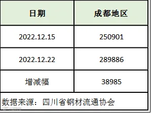 据四川省钢材流通协会统计,截至12月22日,成都地区样本库房中螺纹钢及线材库存总量为289886吨,较上周增加38985吨,较去年同期减少49056吨。本期社会库存量继续增加,且增幅扩大,由于终端需求进一步缩小。