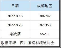 据四川省钢材流通协会统计,截止8月25日成都地区样本库房中螺纹钢及线材库存总量为361953吨,较上周增加55211吨,较去年同期减少269389吨。本期社会库存量止跌回升,因省外资源到货增加,同时高温限电也影响终端需求。