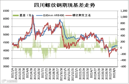 统计数据显示,成都建筑钢材现货价格与上期所螺纹钢期货价格存较强联动性,基差正常波动区间为-100-300元/吨。本周现货价格弱于期货,8月26日成都Φ20mmHRB400现货价为4300元/吨,RB2210合约期价为4090元/吨,基差为203元/吨,周环比-168元/吨。(备注:基差=现货-期货)