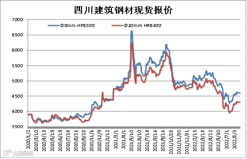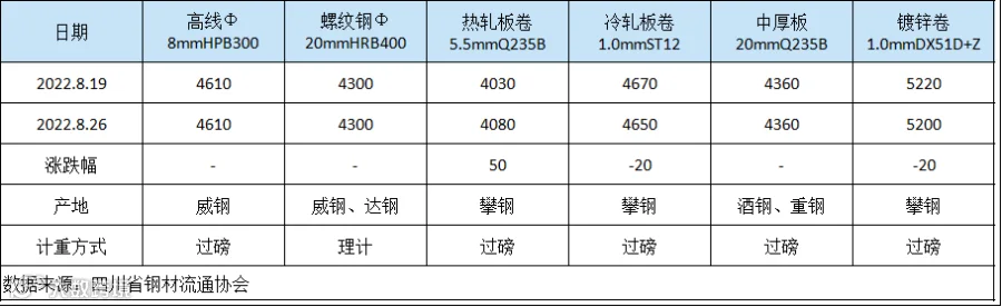 据四川省钢材流通协会对成都现货市场监测显示,本期建筑钢材价格相对平稳,受限电影响钢材产量继续减少,但终端需求低迷,现货市场成交低弱。8月26日,成都地区Φ20mm HRB400螺纹钢价格为4300元/吨,较8月19日持平;Φ8mm HPB300高线价格为4610元/吨,持平。