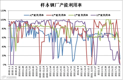 (8月19日-8月25日)四川省钢材流通协会对四家样本钢厂关于建材产能利用率统计数据显示,A、B、C、D较上周分别下调25%、20.55%、3%、5%。