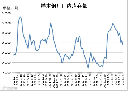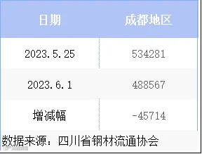据四川省钢材流通协会统计,截止6月1日成都地区样本库房中螺纹钢及线材库存总量为488567吨,较上周减少45714吨,较去年同期减少77759吨。本期社会库存继续下滑,由于产量下降,同时商家仍以降库为主。