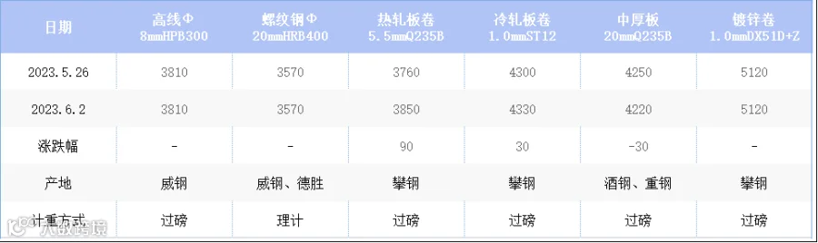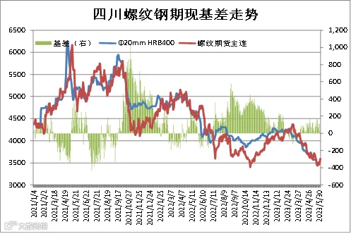 统计数据显示,成都建筑钢材现货价格与上期所螺纹钢期货价格存较强联动性,基差正常波动区间为-100-300元/吨。本期现货价格弱于期货价格,6月2日成都Φ20mmHRB400现货价为3570元/吨,RB2310合约期价为3596元/吨,基差为-26元/吨,周环比-103元/吨。(备注:基差=现货-期货)