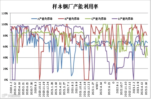 (5月26日-6月1日)四川省钢材流通协会对四家样本钢厂关于建材产能利用率统计数据显示,A、B、C较上周分别下调1%、5.22%、16%;D与上周持平。