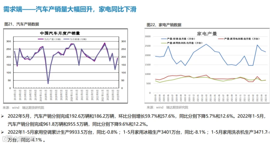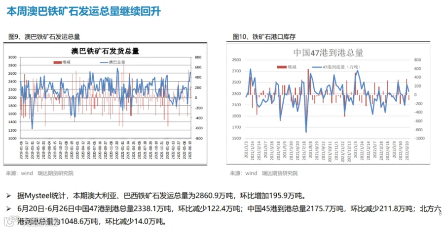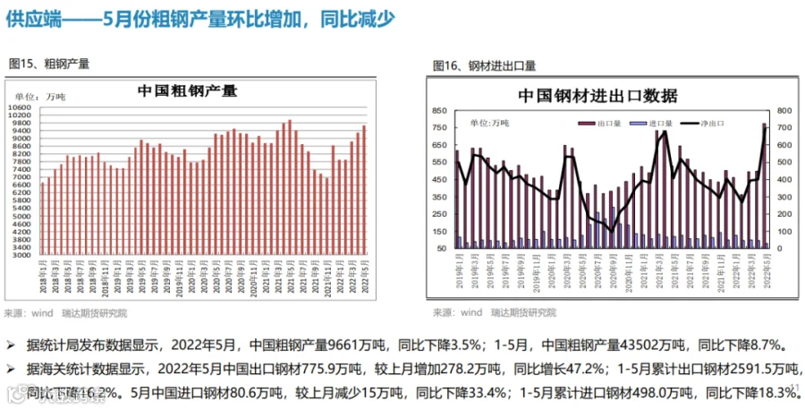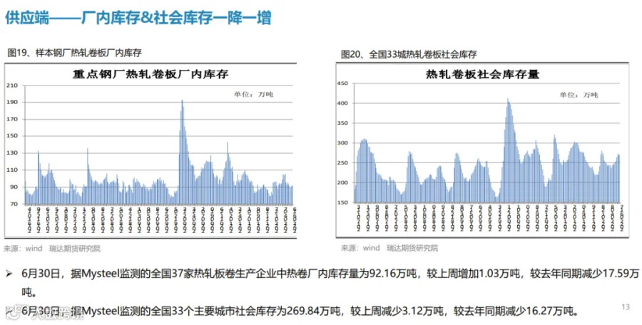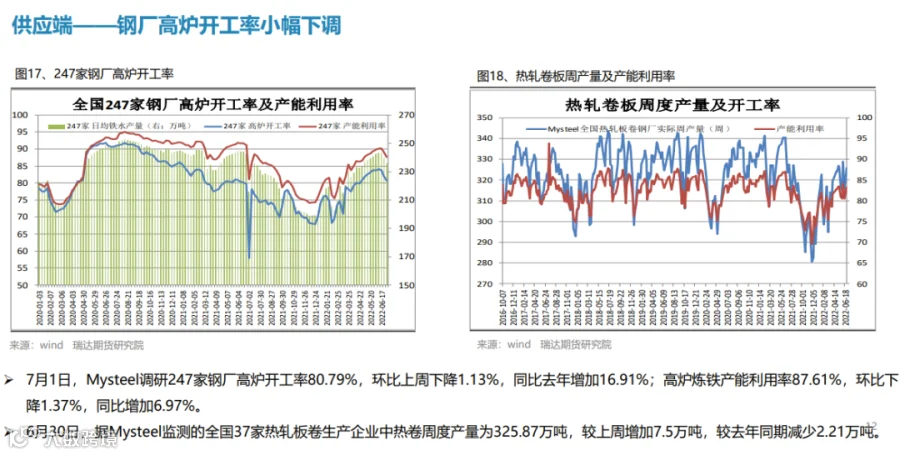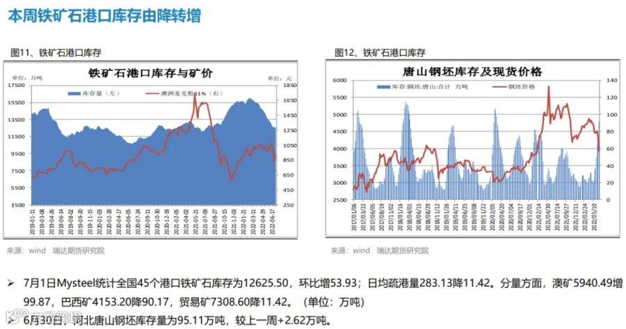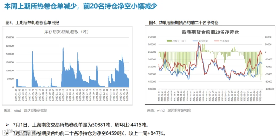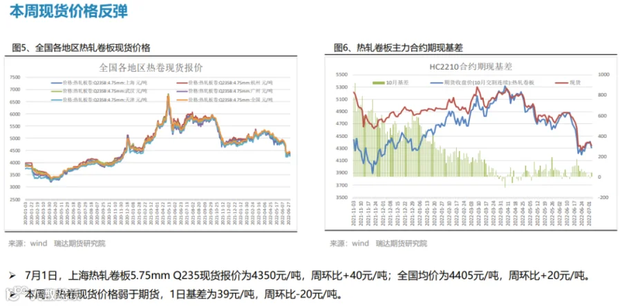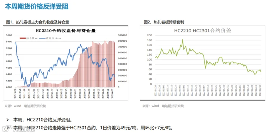 本周(6.24-7.1)热轧卷板价格冲高回落。随着河北钢坯现货报价上调,同时CMF报告预测,下半年中国实际GDP增速有望达到6.4%,提振市场多头情绪,热卷价格顺势上行。下半周则承压回调,因钢厂检修增多,炉料现货需求减少预期增强,双焦及铁矿石价格大幅回落拖累成材,另外美国5月PCE价格指数同比涨幅接近40年峰值,鲍威尔鹰派言论推高美元指数打压大宗商品。下周(7.1-7.8)热卷价格或延续区间整理。供应端,本期热卷周度产量继续小幅反弹,产能利用率提升至83%附近,产量接近去年同期水平,前期有消息称“6月底-7月份唐山及周边共计8家钢企10座高炉计划检修减产”,继续关注限产政策。需求端,下游需求表现一般,热卷厂内库存与社会库存一增一降,变化不大,需求回暖预期迟迟未能兑现。最后,美国通胀压力仍较大,美联储官员维持鹰派言论,激进加息将继续利空大宗商品价格,而国内稳增长政策仍为主基调。