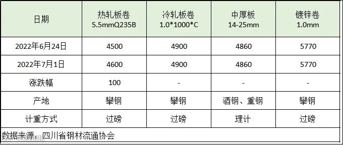 据四川省钢材流通协会对本周成都现货市场监测显示:热轧板卷较上周价格涨100元/吨;冷轧板卷较上周价格持平;中厚板价格较上周价格持平,镀锌卷价格较上周价格持平。