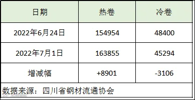 据四川省钢材流通协会统计,本周成都地区样本库房中热卷库存量为163855吨,较上周增加8901吨。冷卷库存量为45294吨,较上周减少3106吨。