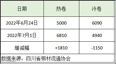 本周四川省钢材流通协会对样本钢厂关于板材出货量统计数据显示,热卷出货量6810吨,较上周增加1810吨。冷卷出货量4940吨,较上周减少1150吨。