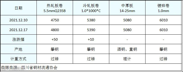 据四川省钢材流通协会对本周成都现货市场监测显示;热轧板卷较上周价格上涨50元/吨;冷轧板卷较上周价格下跌10元/吨;中厚板 镀锌卷价格较上周价格持平。