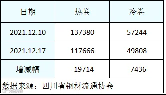 据四川省钢材流通协会统计,本周成都地区样本库房中热卷库存量为117666吨,较上周减少19714吨。冷卷库存量为49808吨,较上周减少7436吨。