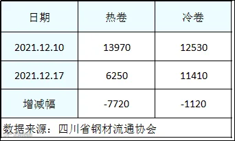 本周四川省钢材流通协会对样本钢厂关于板材出货量统计数据显示,热卷出货量6250吨,较上周减少7720吨。冷卷出货量11410吨,较上周减少1120吨。