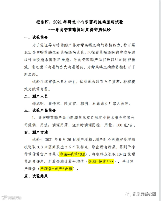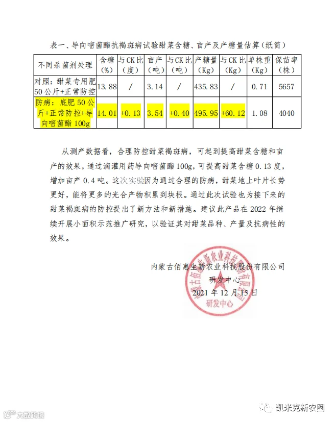 2021年6月20日,凯米克公司在内蒙古林西县与佰惠生新农业基地开展了“导向型嘧菌酯在甜菜上化控防治褐斑病”的联合试验示范,成果如下报告所述: