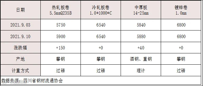 据四川省钢材流通协会对本周成都现货市场监测显示;热轧板卷较上周上涨150元/吨;冷轧板卷较上周价格持平;中厚板较上周上涨40元/吨;镀锌板上周价格持平。