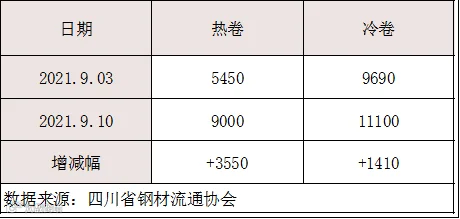 本周四川省钢材流通协会对样本钢厂关于板材出货量统计数据显示,热卷出货量9000吨,较上周增加3550吨。冷卷出货量11100吨,较上周增加1410吨。