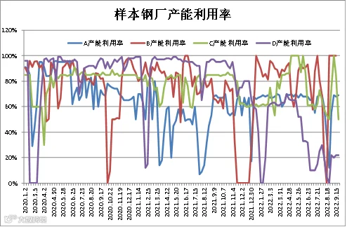 (9月16日-9月22日)四川省钢材流通协会对四家样本钢厂关于建材产能利用率统计数据显示,A较上周提升1%;C较上周下滑35%;B、D则持平。
