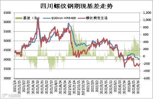 统计数据显示,成都建筑钢材现货价格与上期所螺纹钢期货价格存较强联动性,基差正常波动区间为-100-300元/吨。本周现货价格弱于期货,9月23日成都Φ20mmHRB400现货价为4030元/吨,RB2301合约期价为3766元/吨,基差为264元/吨,周环比-130元/吨。(备注:基差=现货-期货)