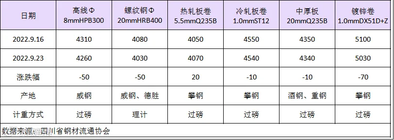 据四川省钢材流通协会对成都现货市场监测显示,本期建筑钢材价格先抑后扬,周初美联储加息预期打压大宗商品价格,下半周随着需求回暖,钢材价格小幅上调。9月23日,成都地区Φ20mm HRB400螺纹钢价格为4030元/吨,较9月16日跌50元/吨;Φ8mm HPB300高线价格为4260元/吨,跌50元/吨。