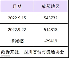 据四川省钢材流通协会统计,截止9月22日成都地区样本库房中螺纹钢及线材库存总量为514313吨,较上周减少29419吨,较去年同期减少119851吨。本期社会库存量由增转降,因钢材产量下滑,而终端需求回暖。
