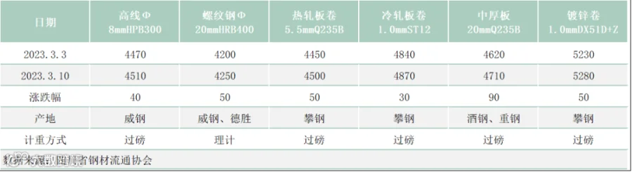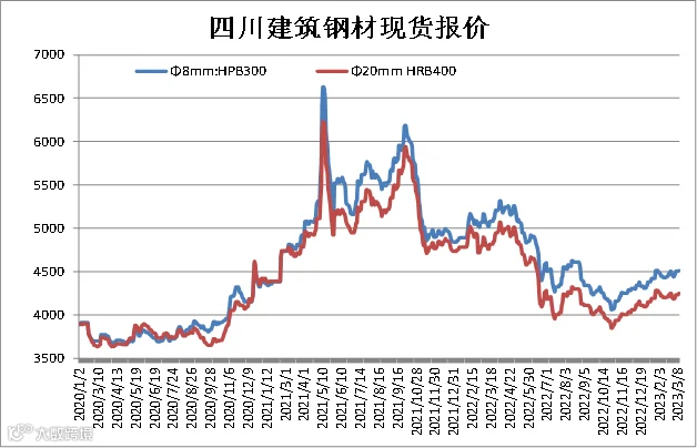 据四川省钢材流通协会对成都现货市场监测显示,本期建筑钢材价格震荡上行,由于期螺向上走高,叠加后市需求预期向好。3月10日,成都地区Φ20mm HRB400螺纹钢价格为4250元/吨,较3月3日涨50元/吨;Φ8mm HPB300高线价格为4510元/吨,涨40元/吨。