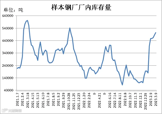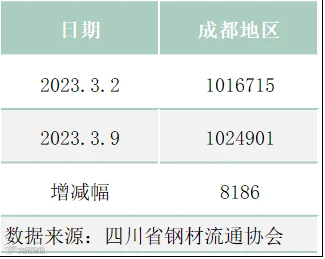 据四川省钢材流通协会统计,截止3月9日成都地区样本库房中螺纹钢及线材库存总量为1024901吨,较上周增加8186吨,较去年同期增加284996吨。本期社会库存继续提升,由于产量延续增加,叠加省外资源到货增多提升现货供应。