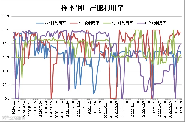 (3.3—3.10)四川省钢材流通协会对四家样本钢厂关于建材产能利用率统计数据显示,B、C较上周分别上调3.56%、2%;D持平;A较上周减少4%。