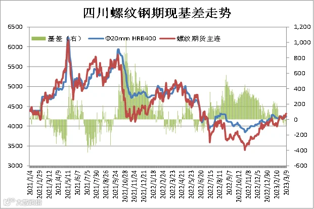 统计数据显示,成都建筑钢材现货价格与上期所螺纹钢期货价格存较强联动性,基差正常波动区间为-100-300元/吨。本周现货价格强于期货,3月10日成都Φ20mmHRB400现货价为4250元/吨,RB2305合约期价为4314元/吨,基差-64元/吨,周环比+8元/吨。