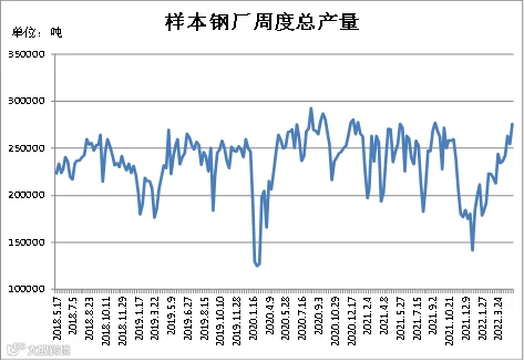 (4月29日-5月5日)四川省钢材流通协会对四家样本钢厂关于建材产量统计数据显示,本周钢厂A、钢厂B、钢厂C较上周分别增加2000吨、1266.93吨、19800吨;钢厂D较上周减少1700吨。四家样本钢厂总产量为275870吨,周环比增加21367吨。