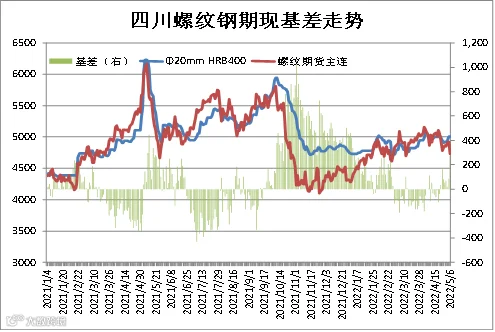 从近五年统计数据显示,成都建筑钢材现货价格与上期所螺纹钢期货价格存较强联动性,基差正常波动区间为0-400元/吨。本周现货价格强于期货,5月6日成都Φ20mmHRB400现货价为5010元/吨,RB2210合约期价为4734元/吨,基差为276元/吨,周环比+256元/吨。(备注:基差=现货-期货)