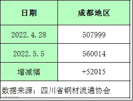 据四川省钢材流通协会统计,截止5月5日成都地区样本库房中螺纹钢及线材库存总量为560014吨,较上周增加52015吨,较去年同期减少114210吨。本期社会库存量增加,由于节假期间下游需求减弱,现货成交萎缩,叠加钢厂产量回升。