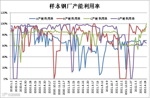 (4月29日-5月5日)四川省钢材流通协会对四家样本钢厂关于建材产能利用率统计数据显示,钢厂A、钢厂B、钢厂C较上周分别增加1%、2.41%、14%;钢厂D较上周减少1%。