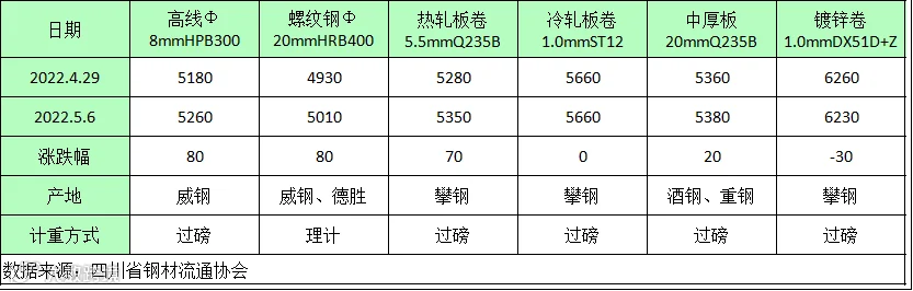 据四川省钢材流通协会对成都现货市场监测显示,本期建筑钢材价格震荡偏 强,由于五一节假期间,钢坯现货报价上调,钢厂及贸易商挺价。5月6日,成都地区Φ20mm HRB400螺纹钢价格为5010元/吨,较4月29日涨80元/吨;Φ8mm HPB300高线价格为5260元/吨,涨80元/吨。