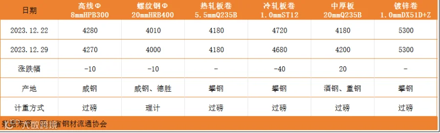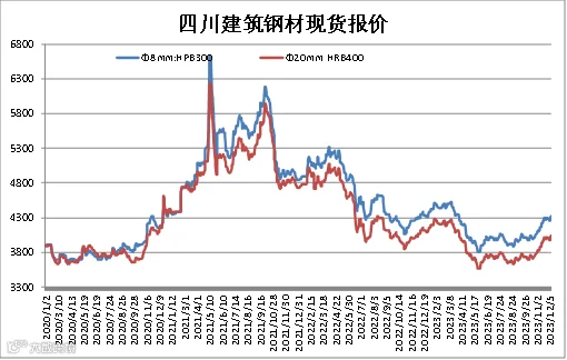 据四川省钢材流通协会对成都现货市场监测显示,本期建筑钢材价格小幅下调,进入消费淡季,终端需求减弱,现货报价下调。12月29日,成都地区Φ20mm HRB400螺纹钢价格为4000元/吨,较12月22日减少10元/吨;Φ8mm HPB300高线价格为4270元/吨,跌10元/吨。