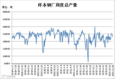 (12月22日-12月28日)四川省钢材流通协会对四家样本钢厂关于建材产量统计数据显示,本周A、C较上周分别减少14000吨、3000吨;B、D较上周分别增加4195.19吨、1300吨。四家样本钢厂总产量为231695吨,周环比减少11505吨。