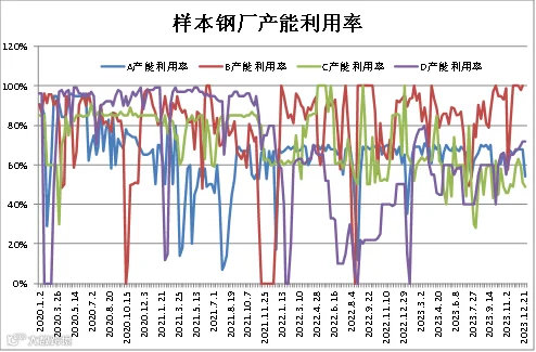 (12月22日-12月28日)四川省钢材流通协会对四家样本钢厂关于建材产能利用率统计数据显示,B较上周提升2%;A、C较上周分别下调14%、2%;D较上周持平。