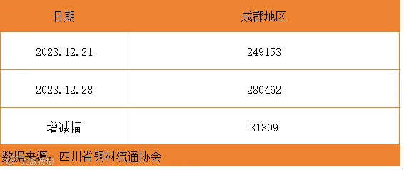 据四川省钢材流通协会统计,截止12月28日成都地区样本库房中螺纹钢及线材库存总量为280462吨,较上周增加31309吨,较去年同期减少73847吨。本期社会库存继续增加,由于终端需求萎缩,成交量下滑。