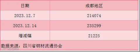 据四川省钢材流通协会统计,截止12月14日成都地区样本库房中螺纹钢及线材库存总量为235299吨,较上周增加21225吨,较去年同期减少15602吨。本期社会库存继续增加,由于终端需求萎缩,贸易商以去库为主。