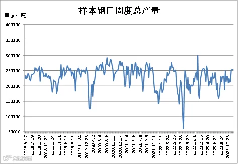 (12月8日-12月14日)四川省钢材流通协会对四家样本钢厂关于建材产量统计数据显示,本周A、C较上周分别减少500吨、6000吨;B、D较上周分别增加3719.77吨、1800吨。四家样本钢厂总产量为252500吨,周环比减少980吨。