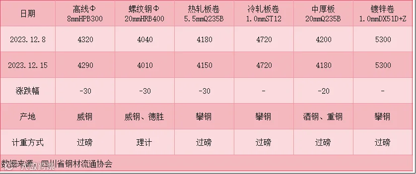 据四川省钢材流通协会对成都现货市场监测显示,本期建筑钢材价格高位回调,产量处在相对高位,而终端需求萎缩,库存持续回升,钢价承压下调。12月15日,成都地区Φ20mm HRB400螺纹钢价格为4010元/吨,较12月8日跌30元/吨;Φ8mm HPB300高线价格为4290元/吨,跌30元/吨。
