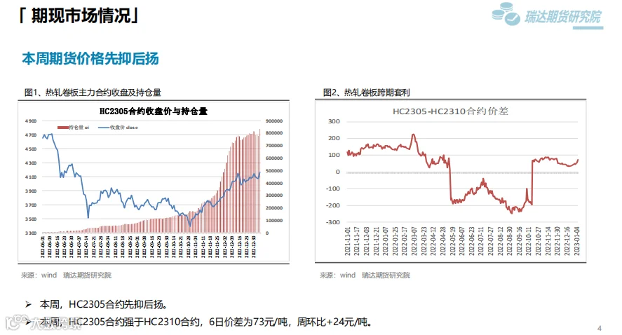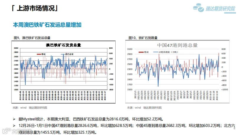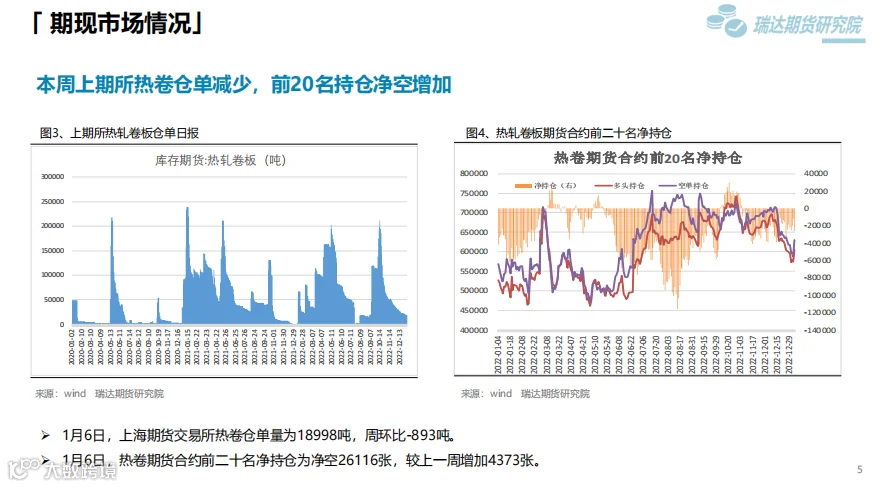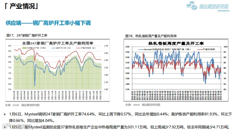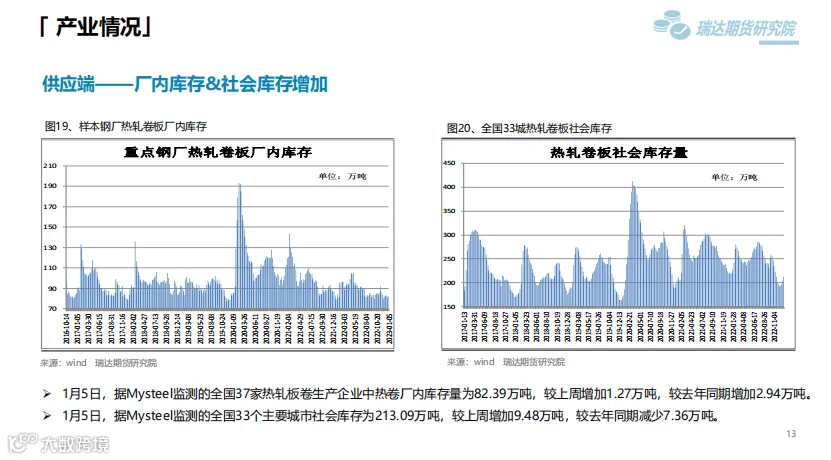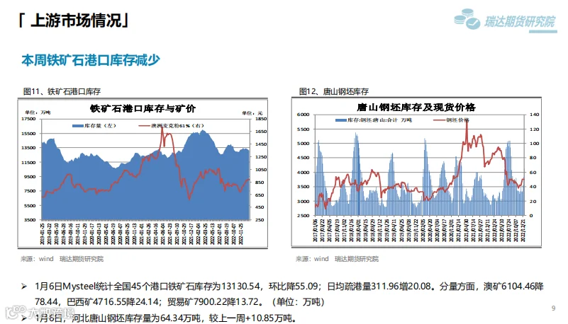 后市展望:供应端,本期热卷周度产量减少,因临近春节假期,部分高炉检修;需求端,厂内库存与社会库存微增,但低于去年同期水平。最后,国内宏观面整体向好,对热卷价格仍有支撑作用。