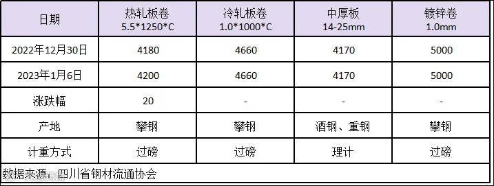 据四川省钢材流通协会对本周成都现货市场监测显示:热轧板卷较上周价格上涨20元/吨;冷轧板卷与上周价格相同;中厚板价格较上周价格上相同;镀锌卷价格较上周价格相同。