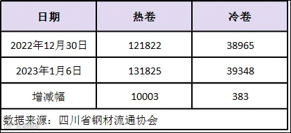据四川省钢材流通协会统计,本周成都地区样本库房中热卷库存量为131825吨,较上周增加10003吨。冷卷库存量为39348吨,较上周增加383吨。