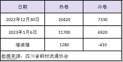 本周四川省钢材流通协会对样本钢厂关于板材出货量统计数据显示,热卷出货量11700吨,较上周增加1280吨。冷卷出货量6920吨,较上周减少410吨。