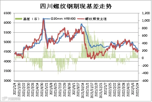 从近五年统计数据显示,成都建筑钢材现货价格与上期所螺纹钢期货价格存较强联动性,基差正常波动区间为0-400元/吨。本周现货价格弱于期货,5月27日成都Φ20mmHRB400现货价为4580元/吨,RB2210合约期价为4576元/吨,基差为4元/吨,周环比-58元/吨。(备注:基差=现货-期货)