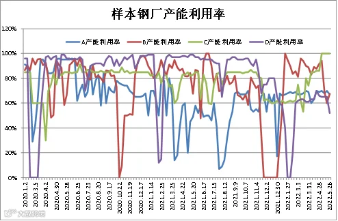 (5月20日-5月26日)四川省钢材流通协会对四家样本钢厂关于建材产能利用率统计数据显示,A、D较上周减少3%、13%;B较上周增加7.48%;C较上周持平。