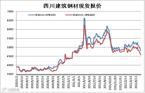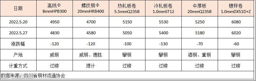 据四川省钢材流通协会对成都现货市场监测显示,本期建筑钢材价格继续下调,由于终端需求差于预期,叠加螺纹钢期价走弱,市场情绪较差。5月27日,成都地区Φ20mm HRB400螺纹钢价格为4580元/吨,较5月20日跌120元/吨;Φ8mm HPB300高线价格为4830元/吨,跌120元/吨。