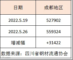 据四川省钢材流通协会统计,截止5月26日成都地区样本库房中螺纹钢及线材库存总量为559324吨,较上周增加31422吨,较去年同期增加126306吨。本期社会库存量继续增加,且高于去年同期,由于雨水天气增多,终端需求表现不佳,贸易商出货受阻。